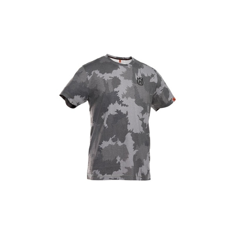 T-shirt z krótkim rękawem typu unisex, z szarym nadrukiem moro. T-shirt idealnie nadaje się do noszenia pod swetrem w chłodniejsze dni lub samodzielnie w cieplejszych temperaturach.