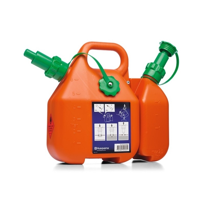 Ten opracowany przez firmę Husqvarna kanister Combi jest skutecznie zabezpieczony przed przelaniem. Kiedy zbiornik jest pełen, wlew odcinany jest automatycznie i można unieść kanister bez rozlewania paliwa. Pojemniki można oddzielić, tworząc miejsce na pilniki i narzędzia.